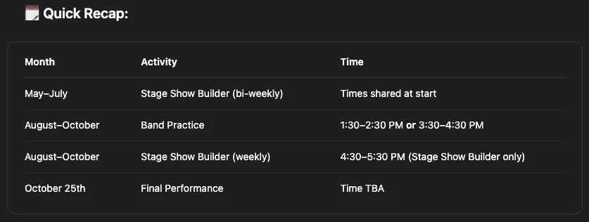 • Bi-weekly sessions to design your show and prepare for band practice.